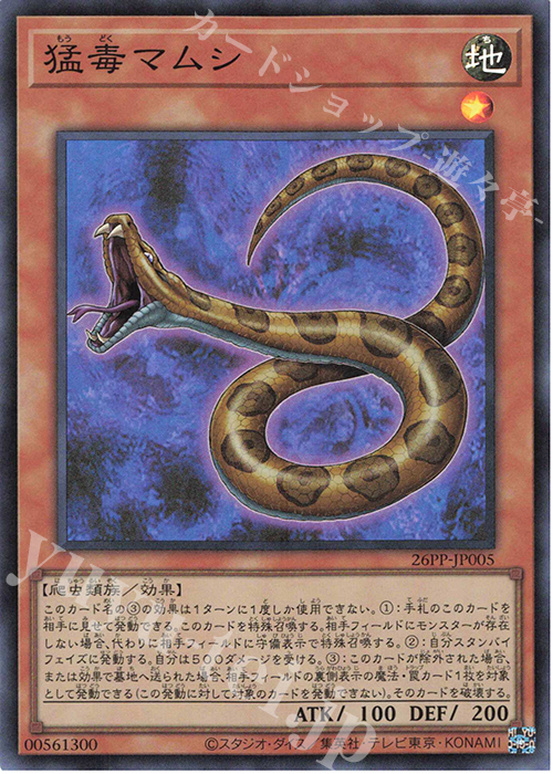 | このカード名の③の効果は1ターンに1度しか使用できない。 ①:手札のこのカードを相手に見せて発動できる。このカードを特殊召喚する。相手フィールドにモンスターが存在しない場合、代わりに相手フィールドに守備表示で特殊召喚する。 ②:自分スタンバイフェイズに発動する。自分は500ダメージを受ける。 ③:このカードが除外された場合、または効果で墓地へ送られた場合、相手フィールドの裏側表示の魔法・罠カード1枚を対象として発動できる(この発動に対して対象のカードを発動できない)。そのカードを破壊する。 | |