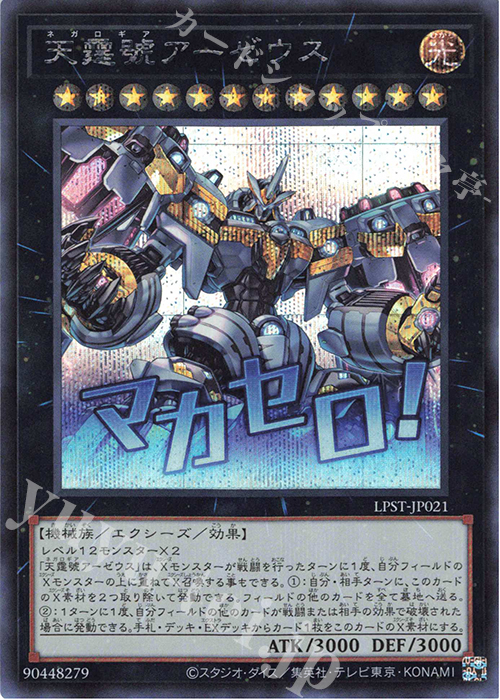 | レベル12モンスター×2 「天霆號アーゼウス」は、Xモンスターが戦闘を行ったターンに1度、自分フィールドのXモンスターの上に重ねてX召喚する事もできる。 ①:自分・相手ターンに、このカードのX素材を2つ取り除いて発動できる。フィールドの他のカードを全て墓地へ送る。 ②:1ターンに1度、自分フィールドの他のカードが戦闘または相手の効果で破壊された場合に発動できる。手札・デッキ・EXデッキからカード1枚をこのカードのX素材にする。 | |