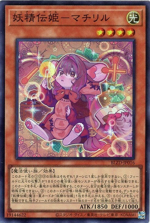 | このカード名の①②③の効果はそれぞれ1ターンに1度しか使用できない。 ①:フィールドに元々の攻撃力が1850の魔法使い族モンスターが存在する場合に発動できる。このカードを手札・墓地から特殊召喚する。このターン、自分は魔法使い族モンスターしか特殊召喚できない。 ②:このカードが召喚・特殊召喚した場合に発動できる。デッキから「妖精伝姫」魔法・罠カードか「妖精の伝姫」1枚を手札に加える。 ③:500LPを払って発動できる。相手フィールドの効果モンスター1体のカード名を「妖精の王子様」として扱う。 | |